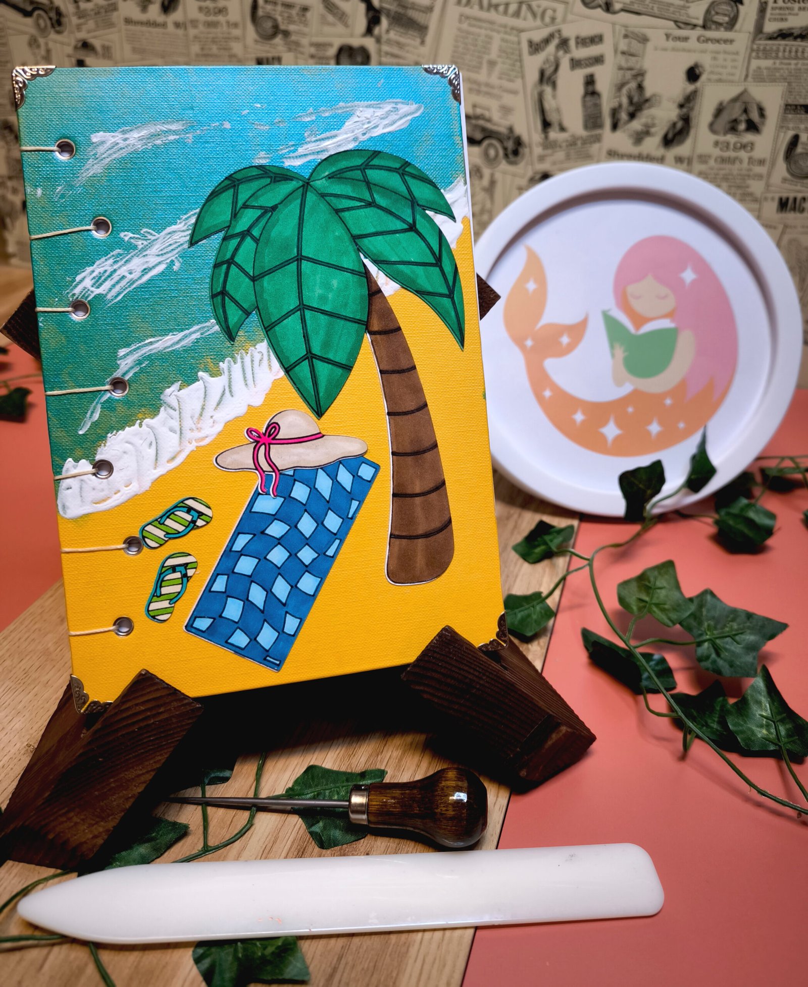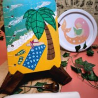 - Décors en papier cartonné (palmier, rochers, serviette, chapeau, tongs, planche de surf, ballon) 100 g/m2, colorisés et collés à la main.